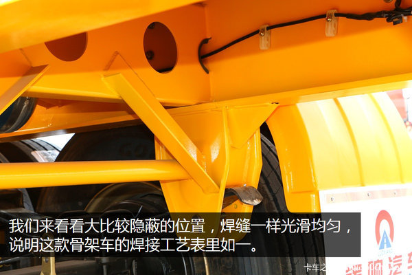 我们来看看大梁内部比较隐蔽的位置,焊缝一样光滑均匀,说明这款骨架车的焊接工艺表里如一,整个挂车的焊接还是非常不错的。