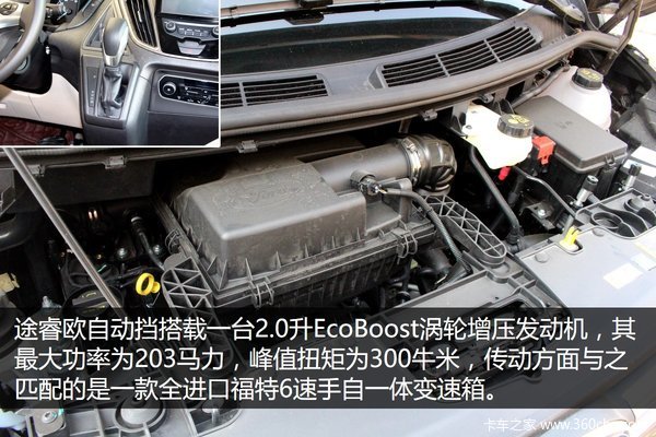 途睿欧自动挡搭载一台2.0升EcoBoost涡轮增压发动机,其最大功率为203马力,峰值扭矩为300牛米,传动方面与之匹配的是一款全进口福特6速手自一体变速箱。