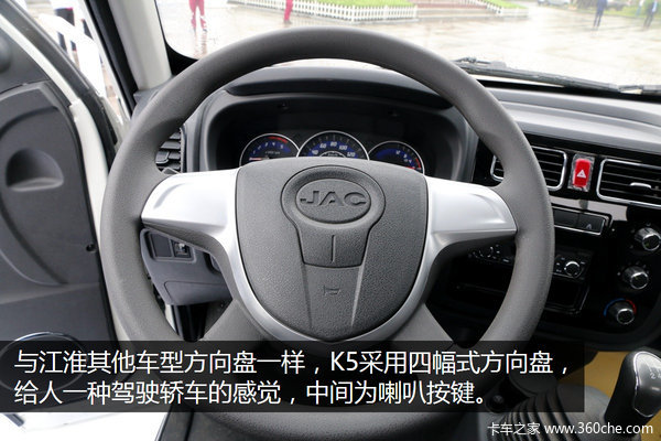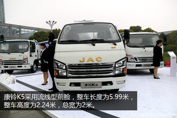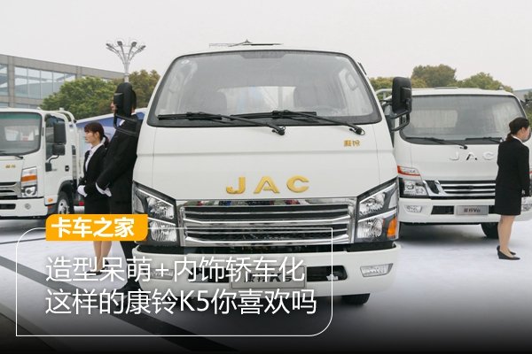 【卡车之家 原创】江淮康铃定位于同城配送及城郊物流,康铃K5是江淮全新开发的康铃二代产品,与之前的产品相比,康铃K5无论是在前脸上还是在内饰上都有了比较明显的改变,其凸出的前脸及轿车化驾驶室更是让人眼前一亮。