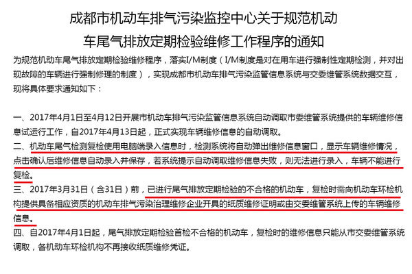 在《规范机动车尾气排放定期检验维修工作程序的通知》中,明确指出成都将进一步落实I/M制度。I/M制度是对在用车进行强制性定期检测,并对出现故障的车辆进行强制修理的制度。