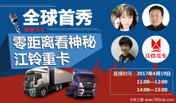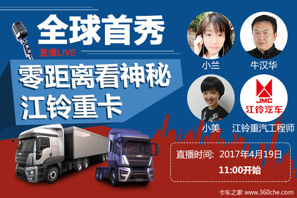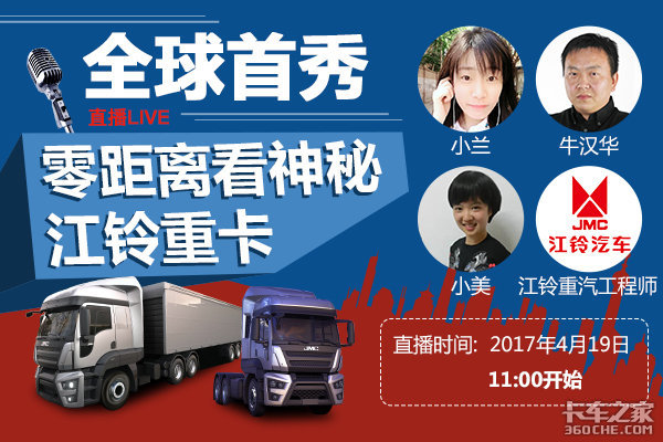 4月19日,也就是上海车展媒体日首日,我们将会在上午九点开始进行江铃重卡展台看车直播。直播将由卡车之家美女主播王小美、卡车之家技术研究院主任牛汉华和江铃重汽的专业工程师为大家带来最客观专业的新车详解,这款到现在只知外形而对其内饰、底盘等一概不知的神秘重卡也将首次通过我们的直播平台为大家展现。