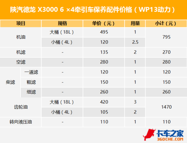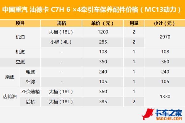 重汽HOWO选择的车型是MC13动力的后双驱牵引车。下面这张表格是这款车各保养项目配件的价格和用量。(不得不说曼机加注的机油是真的很多)