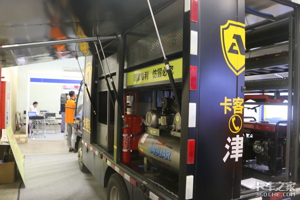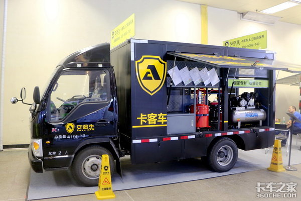 在展会上见到的安途生保障车采用江淮康铃轻卡底盘,上装安途生专用保障车车厢,车厢里有空气压缩机、黄油机、发电机等,能够保证正常的更换油品和打黄油。车厢内的货架上还可以摆放机油、防冻液、液压油等商品。
