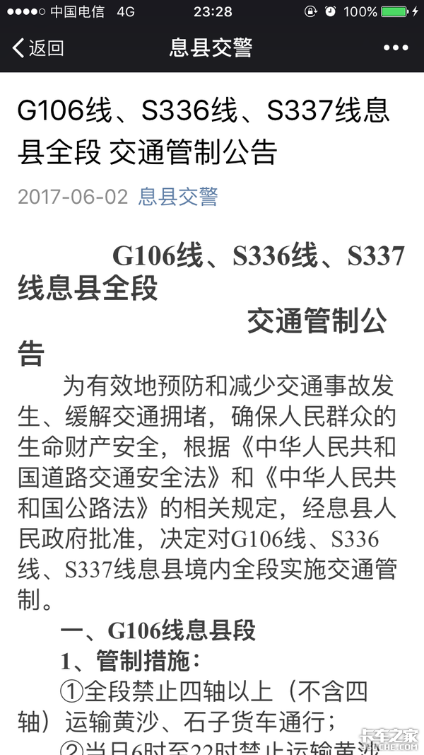【卡车之家 原创】今天我们收到卡友爆料,河南息县全境禁止6轴以上砂石运输车辆通行,运输砂石的8x4及以下车辆根据车辆尾号实行单双号限行,且只能在晚上10:00至次日6:00之间通行。对于违规的车辆,交警、交通执法部门将对车辆驾驶人予以依法查处;同时,公安“天网”电子卡口和电子警察也将全天候对所有车辆进行拍照,发现交通违法行为的,将依法录入违法信息系统。