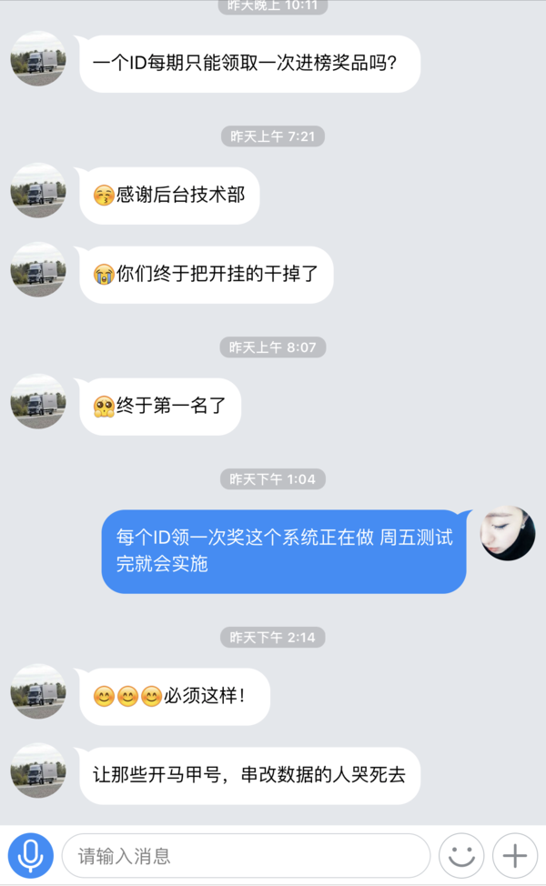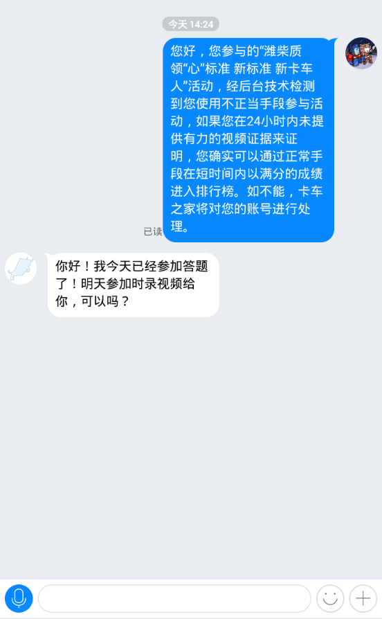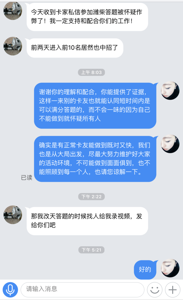 另外卡车之家加强了对答题时间的监测,如果一旦出现答题时间极短、分数极高的情况,工作人员则会主动联系用户,用户提供相应的答题过程视频证明是真实参与而并非作弊。对于作弊的行为,我们坚决“零容忍”,如果用户收到卡车之家工作人员的私信时也敬请谅解,目的就是为了给广大卡友一个公平的环境。