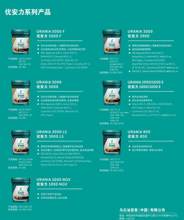根据目前得到的消息,此次发布会马石油将发布6款柴油发动机机油、1款天然气发动机机油共7款优安力系列机油产品,API等级覆盖了CF、CF-4、CH-4、CI-4、CJ-4。