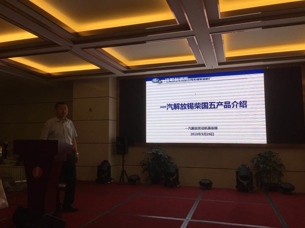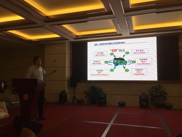 在会议现场,一汽锡柴川藏事业部经理何广山讲解6DM2产品的卓越性能,6DM2国五产品是现在商用车市场上最常用的机型,深受大家一致的推崇,其省油、安全、可靠等超强特性,不负众多卡友们的期待。
