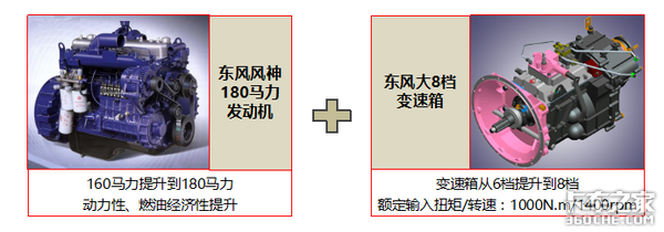 和东风EQH180-52发动机相匹配的是东风大8档变速箱,超速档速比为0.79,最高车速可达到110Km/h,另外用户也可以选择法士特8档箱。