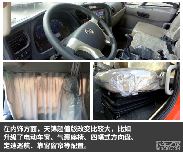 但在内饰方面,天锦超值版改变比较大,比如升级了电动车窗、气囊座椅、四幅式方向盘、定速巡航、靠窗窗帘等配置。