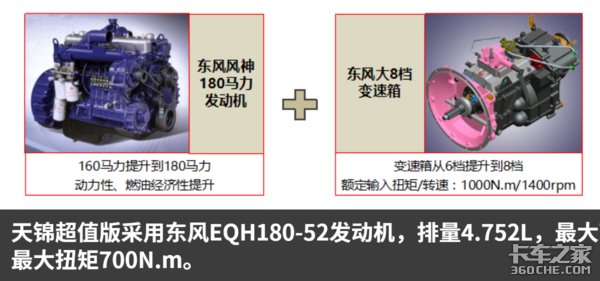 在动力配置方面,天锦超值版由160马力升级到180马力,采用东风EQH180-52发动机,最大可输出180马力,排量4.752L,最大扭矩700N.m。
