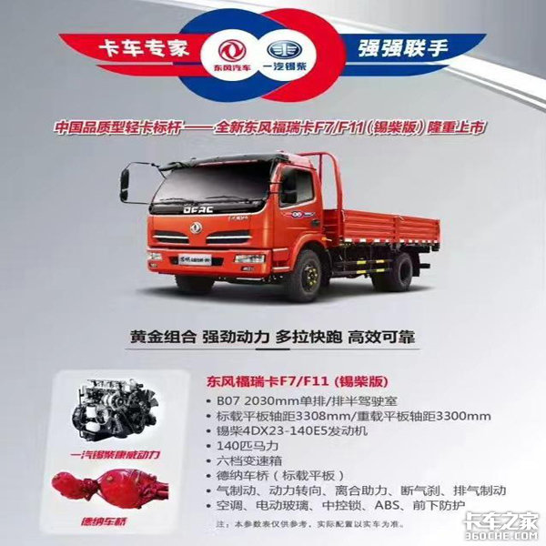 2017年,全新东风福瑞卡开创性融合了一汽锡柴的发动机技术和东风优良的整车基因,为客户奉献出这款在行业内极具竞争力的标杆产品——全新东风福瑞卡F7/F11(锡柴版)。其中,F7(锡柴版)定位于物流标载运输,F11(锡柴版)定位于物流重载运输,F7/F11统一搭载一汽锡柴康威4102国五发动机,在前后桥、车架、轮胎和货箱尺寸等方面采取差异化配置,从而满足了不同客户的承载需求。