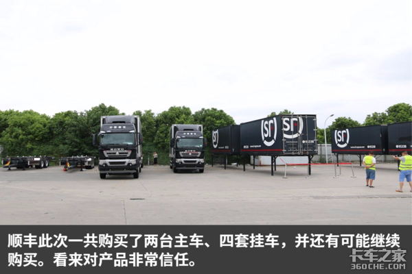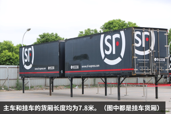 到达顺丰的停车场以后,一下就对这个企业产生了五体投地的敬佩之情——人家不是买一台试一试。仅现场就停了两台主车、三台挂车、4个货厢。工作人员说还有一台挂车没有运来,除了这些以外,顺丰正在准备继续采购——看来已经对产品非常信任了。