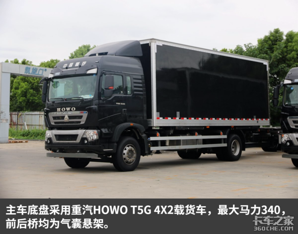 主车底盘采用的是重汽T5G 340马力 4×2载货车,全车气囊,配10档变速箱,后桥速比4.63,轮胎型号为295/80 R22.5。