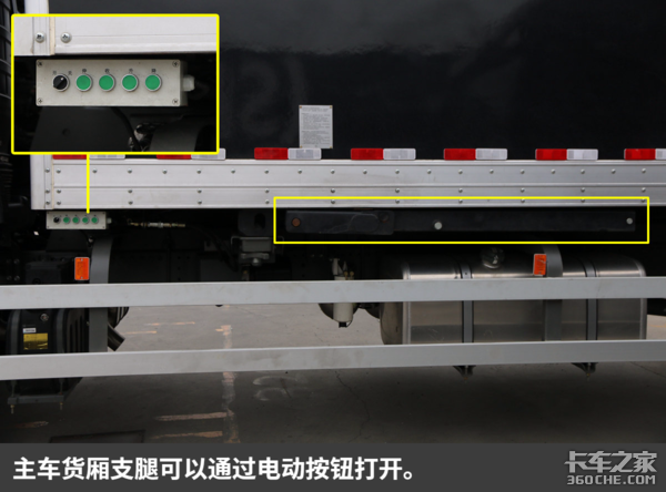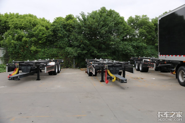 无论是主车还是挂车,货厢的更换都可以这样操作。由于主车货厢的支腿还可以电动控制,因此“甩箱”的过程也耗费不了太多时间。而挂车货厢更换频率并不高,电动支腿的可靠性又不如机械结构耐用,因此并没有为它的支腿设置电动装置。