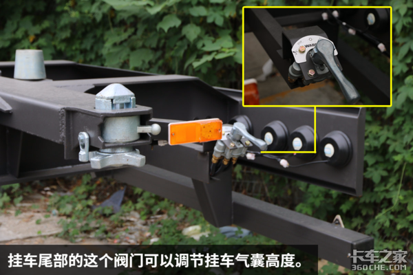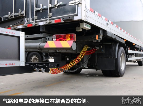 主车和挂车之间通过这个耦合器连接,通过操作这个拨杆可以打开耦合器的锁扣。另外耦合器的结构看起来并不如牵引车鞍座结实。假如挂车部分配重合理的话,这个地方承受的垂直载荷就会很小;刹车设计合理的话,在急刹车时它也不会收到太大的载荷。因此,它十分考验厂家的设计水平。