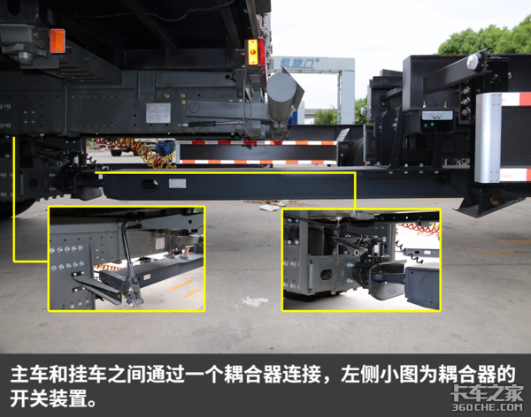 货厢和底盘之间通过四个扣件连接,有些类似于集装箱。每一个货厢都有四个支腿(上一张图片可以明显地看到),可以拆卸。主车和挂车连接方式相同。