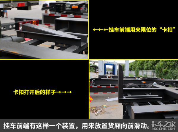 而在挂车底盘的前部,有这样一个东西,在装货厢之前,需要把它打开,这样一来装好货厢以后,它可以防止货厢向前滑动,造成事故。