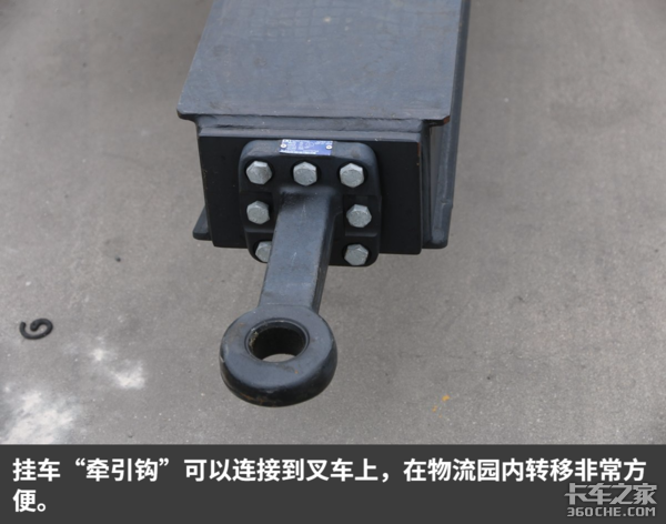 挂车部分的“牵引钩”位置比较低,这样一来在物流园区内,用一台叉车就可以拖着转移,不需要再动用一个拖头(顺丰方面已经尝试过了,完全可以)。