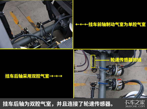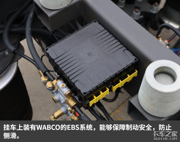 由于挂车部分车桥在中间部分,有些类似于“跷跷板”的结构,不如挂车一样稳定,因此在制动过程中就存在侧滑的风险,因此,这台挂车配备了威伯科的EBS系统。但不知为何,这台挂车只在后轴看到了轮速传感器的连接线。