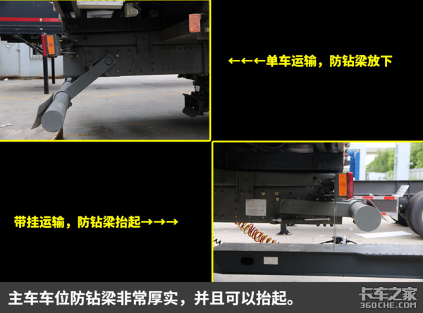 主车部分的后防钻梁设计的非常厚实,并且可以向上翻开,以方便主车和挂车的连接,设计得非常巧妙。