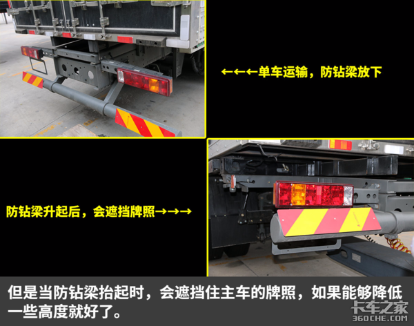 防钻梁的设计虽然非常巧妙,但是当它向上翻起来时,会有些遮挡车牌。对此,顺丰的相关负责人表示可能会选择将车牌挂在车尾部中央位置。这一点其实改进起来也非常容易,重汽将牌照框向下挪一下就可以了。
