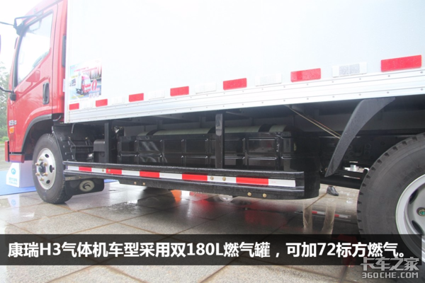 时代H3气体机车型的两侧分别设计了180L的燃气罐,可储存72标方CNG天然气。据之前官方数据显示,重载(4T)时续航里程可达到423公里。