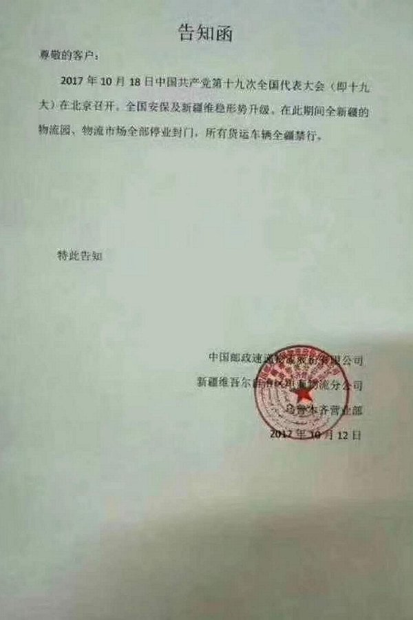告知函内容如下:“尊敬的客户:2017年10月18日中国共产党第十九次全国代表大会(即十九大)在北京召开,全国安保及新疆维稳形势升级。在此期间全新疆的物流园、物流市场全部停业封门,所有货运车辆全疆禁行。特此告知”