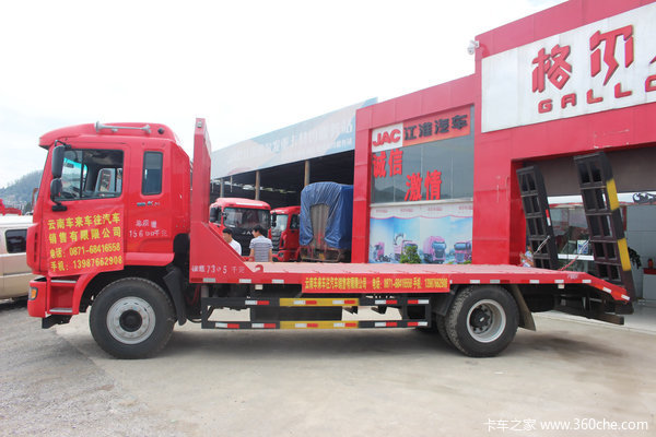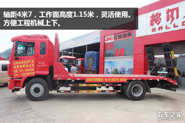 【卡车之家 原创】随着全国各地基建的开展,工程机械运输车型越来越专业化。工程机械本身自重大,所以需要承载能力强的底盘。同时负载比较集中,因此上装设计生产需要用真材实料,否则使用中会给用户带来很多的维修工作。有些需要进山区的工程机械则需要短轴距车型,从而提高灵活性。江淮格尔发的4x2平板车就是这样一款车型。