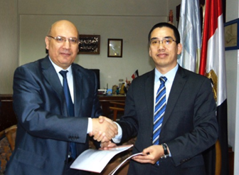 活动现场,比亚迪中东非洲汽车销售事业部总经理黄志学(右)与亚历山大市交通管理局主席Khaled Eleiwa进行签约