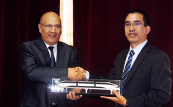 比亚迪中东非洲汽车销售事业部总经理黄志学(右)将云轨模型赠与亚历山大市交通管理局主席Khaled Eleiwa
