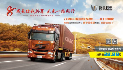 联合卡车K13旗舰全国限量8台,是的!您没看错!除了超低的价格,还有18万公里免费保养!自10月28日起连续8天,联合卡车微信公众号将在线上平台发售以下车型,每天11台。联合卡车的粉丝们,还等什么,赶紧行动吧!