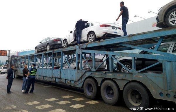 1、在检查过程中发现,合规六位车将尾板抽出装载乘用车;