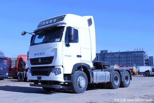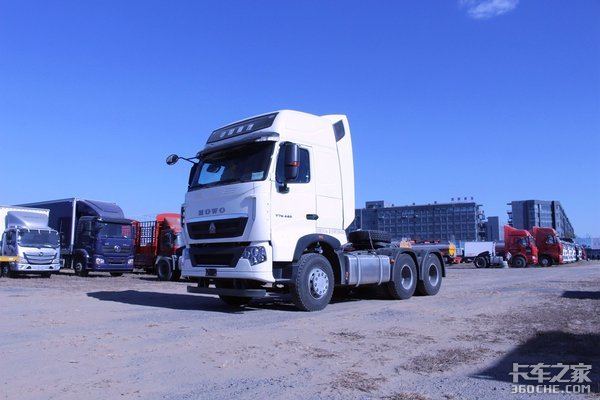 车门处的“T7H 440”简洁明了地告诉我们它的车型和动力参数。具体配置上,这台车搭载了MC11发动机,最大输出440马力,最大扭矩2100N·m@1000-1400rpm;变速箱是重汽HW16C变速箱,搭配速比为3.7的驱动桥。