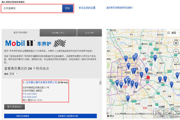 考虑到很多卡友更换机油的不固定性,美孚在官网和官方微信上面推出了经销商定位功能,只要输入你所在地方的地址,例如:北京高碑店,系统就会自动筛选出你附近的美孚经销商,并提供联系方式,卡友们可以通过联系经销商来购买正品机油以及享受相应的服务。