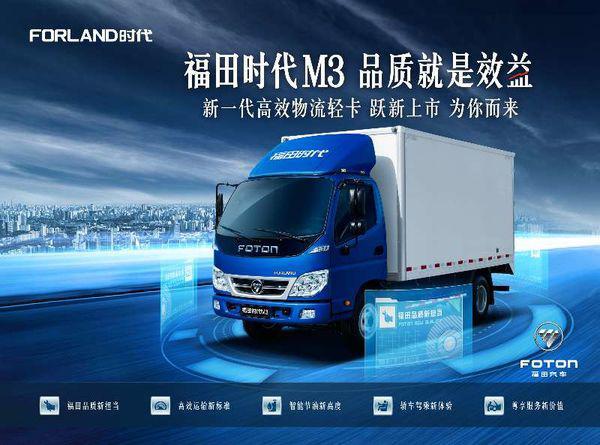 2017年6月28日,新一代高效物流轻卡福田时代M3在上海发布上市,是一款针对城市物流市场消费升级开发的全新一代高品质轻卡,主要面向城市中短途生活、生产资料的配送、运输。