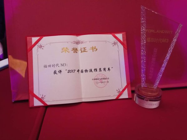 2017年11月18日,福田时代M3轻卡在中国物流与采购联合会主办的“2017(第十五届)中国物流企业家年会”上获评“2017中国物流推荐用车”。