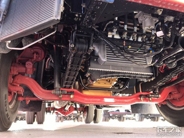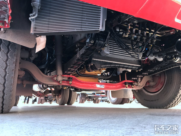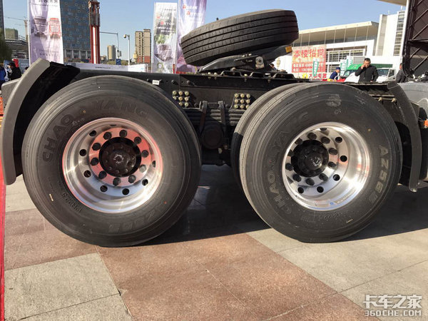 天龙旗舰上市之初,用户对于其最大的诟病即整车质量太重。经过之前的升级改装后,新天龙旗舰的自重大大降低。现场展车采用了朝阳轮胎,搭配美铝的铝合金车轮,进一步降低车重。后桥采用了东风德纳后桥,速比为3.07,同时还有3.42和3.64多种速比可供选择,以适应更多工况。