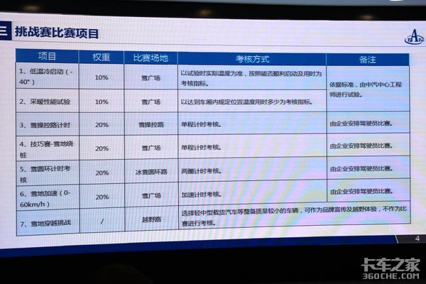 八个项目的满分为100分,其中低温冷启动和采暖性能测试两个项目得分所占权重均为5%,雪操控路计时、雪地绕桩、定点停车、雪圆环计时考核四个项目的得分所占权重均为20%,雪地加速项目得分所占权重为10%,越野路况下的雪地穿越挑战项目为选择展示项,不计入比赛成绩。