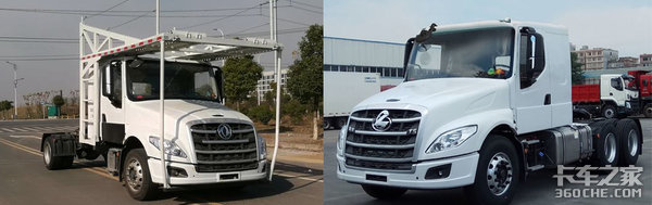 左为东风长头轿运车,右为东风柳汽T5牵引车