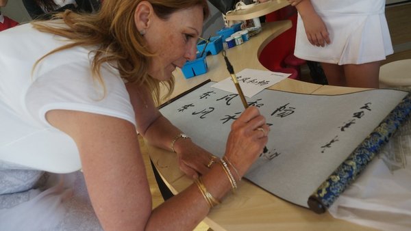 外国友人手书毛笔字“东风和畅”为东风队加油
