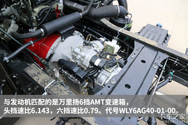 实拍该车采用了万里扬的AMT变速箱,可以看到变速箱上方增加了TCU(控制单元)和相关的换挡机构及传感器等一系列零部件。AMT变速箱既有自动换挡带来的舒适,又保留了手动变速箱齿轮传动带来的高效率和设计成熟的特点,所以性价比较高也是这种变速箱的优势之一。