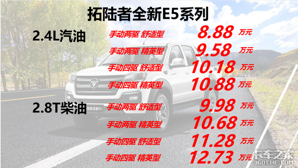 本次上市发布会的第一看点便是全面升级的拓陆者全新E5,其搭载2.4L汽油发动机车型的有手动两驱舒适型、手动两驱精英型、手动四驱舒适型、手动四驱精英型,价格分别为8.88万元、9.58万元、10.18万元、10.88万元;而搭载2.8T柴油发动机的车型同样有手动两驱舒适型、手动两驱精英型、手动四驱舒适型、手动四驱精英型,价格分别为9.98万元、10.68万元、11.28万元、12.73万元。