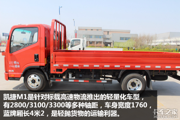 凯捷M1是针对标载高速物流推出的轻量化车型,有2800/3100/3300等多种轴距可选,3300轴距对应的最大厢长为4米2,蓝牌轻卡的最大厢长。从事轻抛货物运输的卡友可以放心选用这款车型。