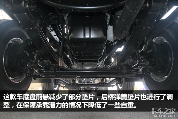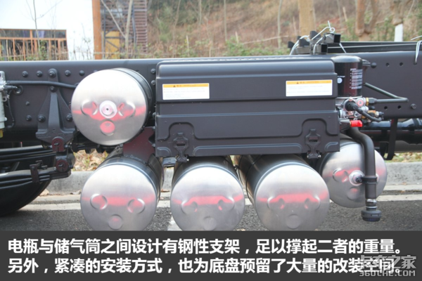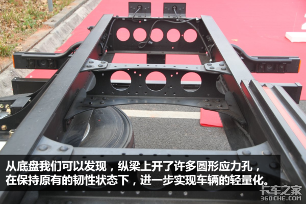 目前,这款车在轻量化第一阶段,整体实现降重178KG。整车除了在车架方面采用大量镂空构件以外,铝合金车轮、铝制储气筒、前后悬架垫片均进行了相应的调整实现整体降重。