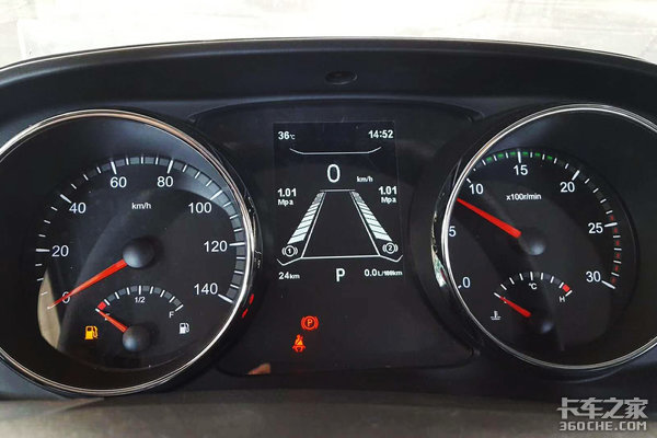 中间位置的液晶显示屏应该可以显示车辆的各种信息,从获取到的图片上来看,显示有室外温度、当前时间、时速、储气筒气压、累计里程、百公里油耗等信息,中间的P显示位置,小编猜测,可能是挡位显示。