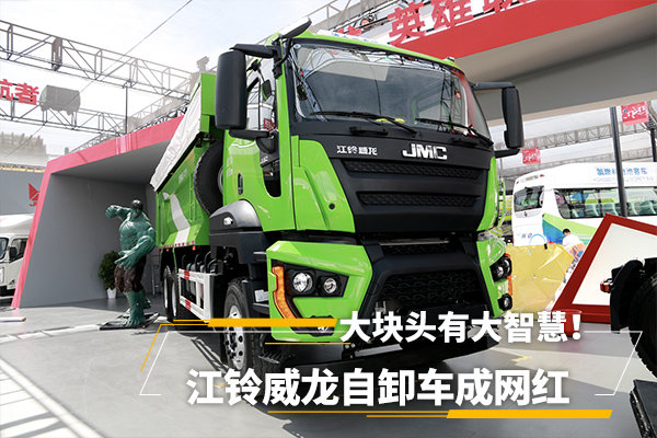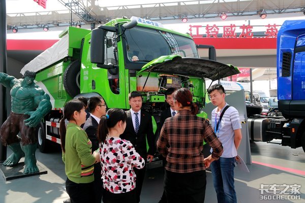 车展的这辆6X4自卸车使用的是清新灵动的绿色涂装,与绿巨人如出一辙。大块头有大智慧,江铃威龙自卸车具有动力强劲、技术领先、高效节油、绿色环保四大特性。