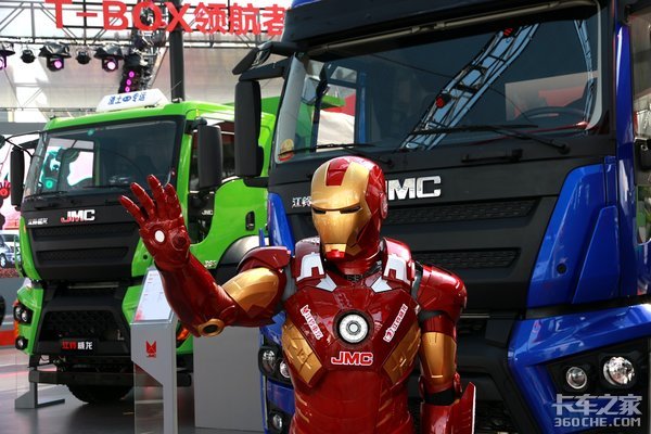 江铃重汽是首次参加北京车展,虽然只有三辆展车,但是展台以及展车却是经过精心布置的。现场还请来了漫威动画英雄“钢铁侠”、“美队”、“绿巨人”为江铃威龙重卡助威。