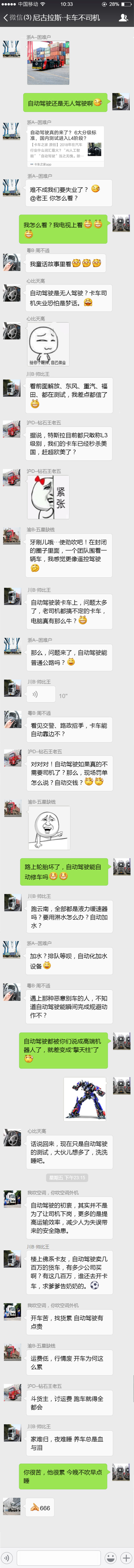 【卡车之家 原创】2018年,商用车行业最火的关键词莫过于“自动驾驶”,行业政策利好,科技快速发展,各大车企的自动驾驶项目逐渐浮出水面,测试一波接一波。现阶段,国内部分车企在自动驾驶测试项目上宣传已经达到了L4级别,在限定场景内,自动驾驶功能已经可以完全接管所有的驾驶操作,驾驶员无须将精力放在驾驶操作之上。这不是意味着卡车司机饭碗要被抢吗?此消息一出,各大微信群也跟着热闹了起来。