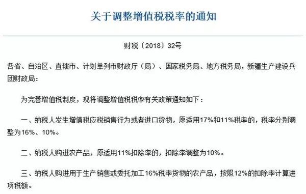 上述财税【2018】32号文,显然是落实3月28日国务院召开常务会议的决定,即,从2018年5月1日起,将制造业等行业增值税税率从17%降至16%,将交通运输、建筑、基础电信服务等行业及农产品等货物的增值税税率从11%降至10%的政策。