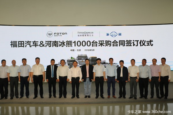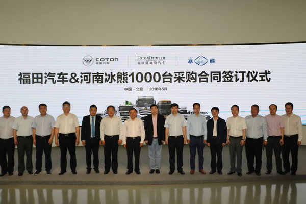 2018年5月13日,福田汽车&河南冰熊1000台采购合同签订仪式在福田戴姆勒汽车北京超级卡车体验中心举行。来自河南商丘市及民权县领导、海航冷链控股股份有限公司、河南冰熊专用车辆制造有限公司、国家电投上海融和慕众新能源科技有限公司等相关合作单位代表、福田汽车集团与福田戴姆勒汽车相关领导及行业媒体代表等50余人出席本次活动。此次,千台冷链定制超级卡车签约,标志着福田戴姆勒汽车通过为冷链物流运输提供的定制化产品和服务一体化解决方案,成功推动冷链物流运输与装备升级。